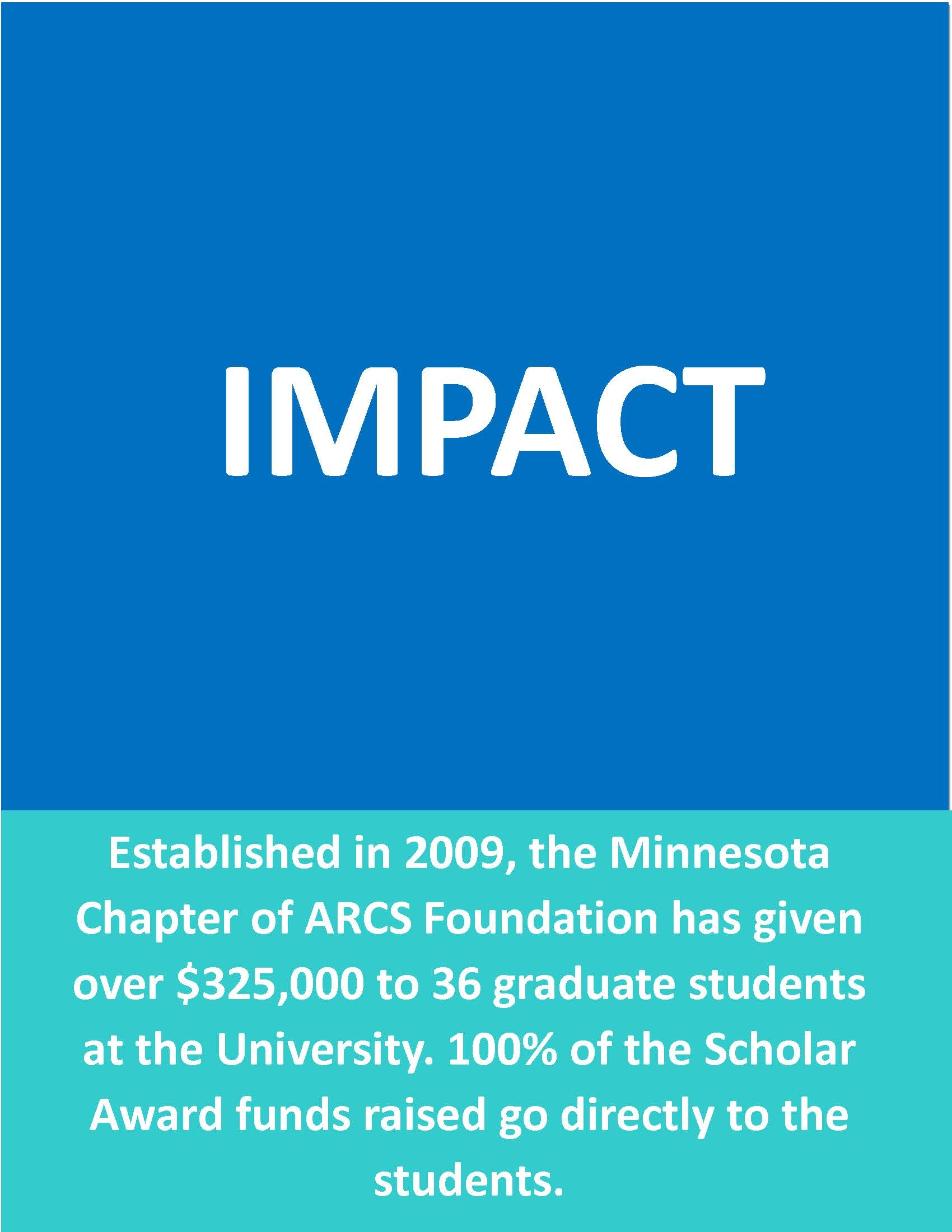 ARCS (Achievement Rewards for College Scientists) Foundation, Inc. offers our donors the opportunity to change the world.  ARCS Awards are unrestricted. These funds enable our scholars to conduct cutting-edge research, which has the potential to solve the challenges of today.
